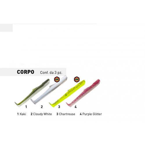 E' un'esca siliconica progettata per pescare vertcalmente,e per strisciare sul fondo.La testa Sabot è dotata di amo Wmc.Il corpo è allungato con sezione piatta e con una conicità orientata dalla testa alla coda.L'amo è composto da una ampia apertura,legata al concetto di Free Hook.Appena dopo l'amo troviamo una pinna dorsale ideata per regolare la torsione del corpo.Disponibile in combo da tre pezzi gia montati con testa da 5/10/15gr